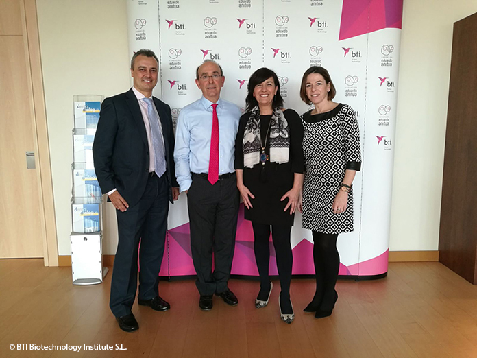 Itziar Epalza, President of the Network of Technology Parks of Euskadi, visited the BTI facilities together with the Deputy Director and Technical Director of the Technology Park of Álava. Accompanied by Dr. Eduardo Anitua, during the visit they have toured both the research, clinical and teaching facilities of the BTI headquarters in Armentia, as well as engineering and production facilities in Miñano.